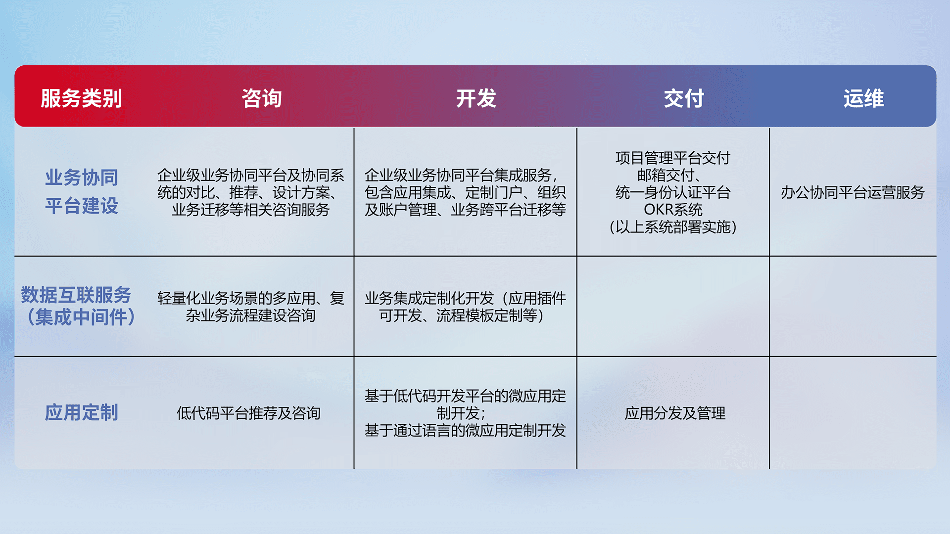针对钉钉、、企微、、IDaas等平台级产品提供产品的规划、、、方案、、交付、、定制化开发等服务,,,实现如统一协同办公、、智能客户服务、、、、混合会议管理、、智能数据查询、、、、等业务场景,,,实现数字化转型。。。。