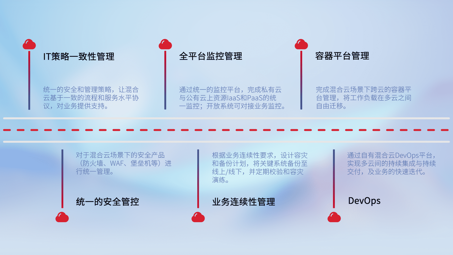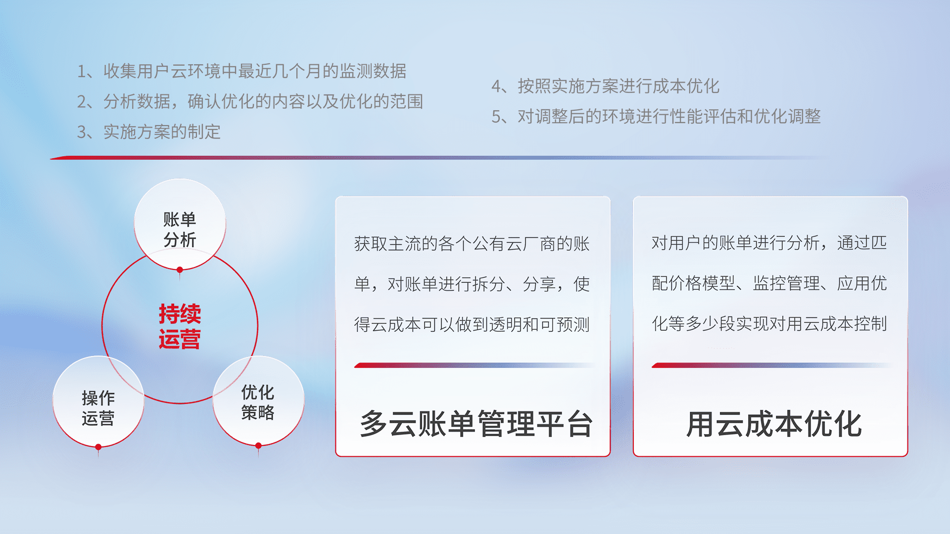 通过多云纳管,,,以统一的资源数据模型把客户的云资源进行抽象和封装,,,,进而实现对多云资源的统一操作,,,,保障云资源管理的可靠性、、稳定性与可用性。。量身定制化运维内容,,配置、、、开发运维、、、、补丁管理、、、备份、、、、监控、、、、认证和访问管理、、审计和日常巡检等,,保障在用云过程中的可靠度,,,稳定度以及高可用率。。