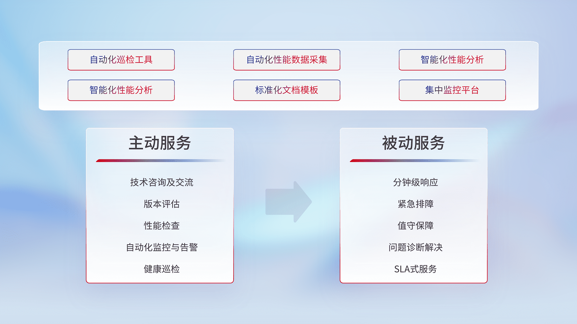 智能化工具和标准化文档,,,保障服务质量,,,,提供主动服务(包含技术咨询、、版本评估、、、、性能检查、、、自动化监控与告警、、、、健康巡检)和被动服务包含(分钟级响应、、、紧急排障、、值守保障、、、、问题诊断解决、、SLA服务)。。。
